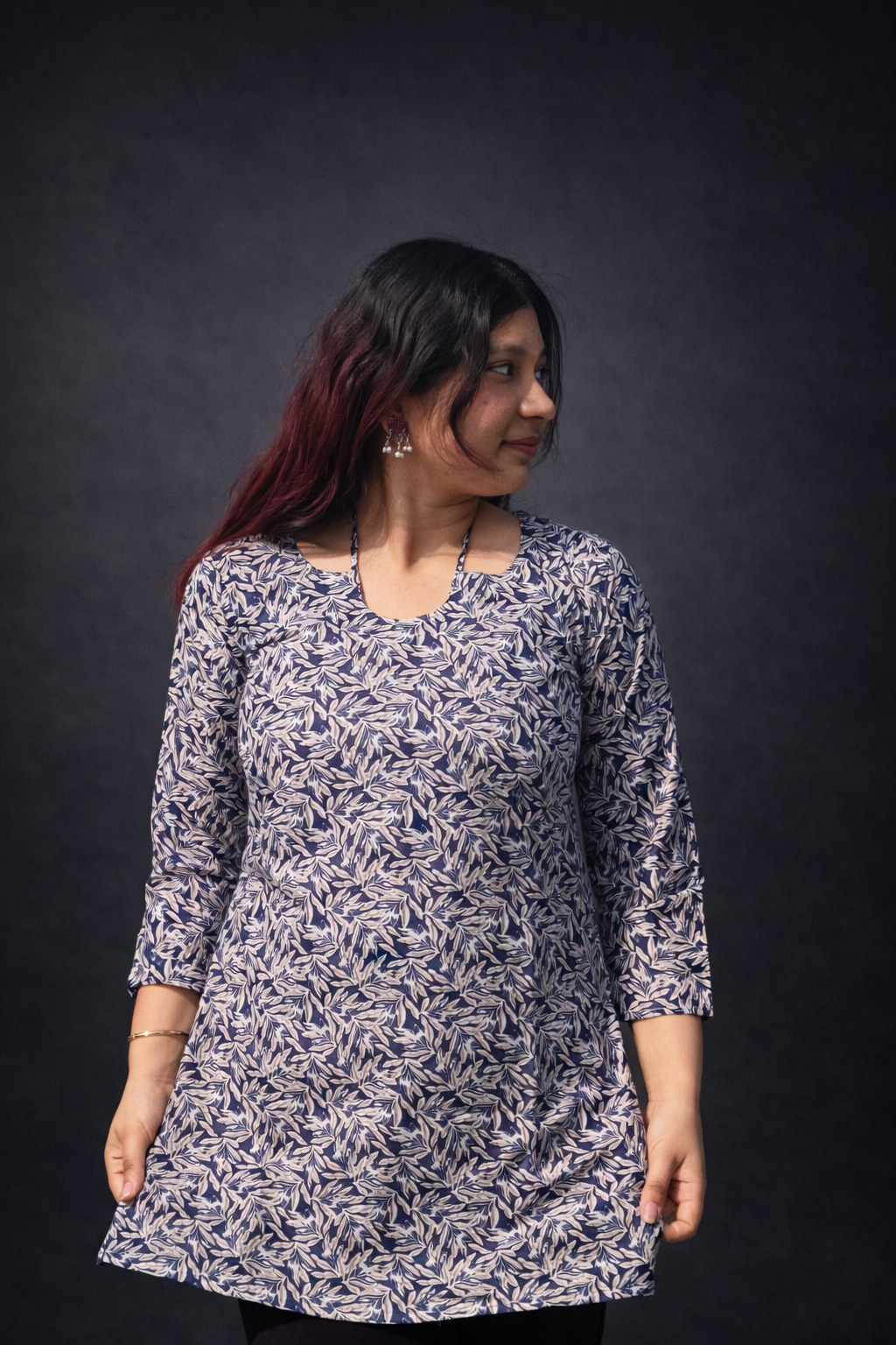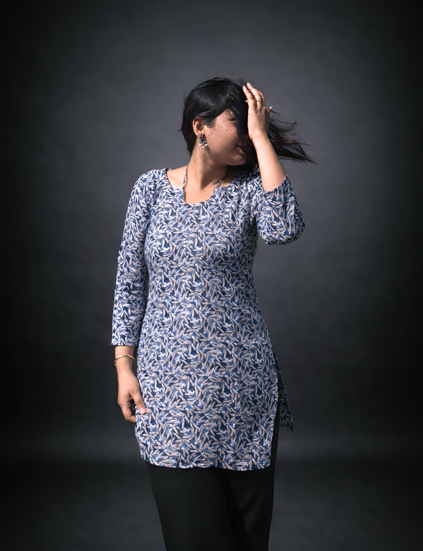 Add effortless elegance to your everyday wardrobe with this women’s blue leaf printed straight kurti. Crafted from a soft and breathable cotton blend fabric, this kurti offers all-day comfort with a stylish ethnic touch. Featuring a classic round neckline, three-quarter sleeves, and a straight fit, it is perfect for daily wear, office wear, college, and casual outings.